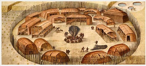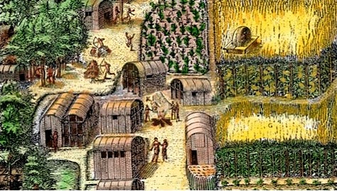 This was one of the principal towns of the Monacan people, whose towns dotted the Rappahannock, Rivanna, and James Rivers above the Fall Line for a thousand years. Right up until the early 18th century. No eyewitness account of Monaskuapanough, or any indigenous Monacan settlement, has come down to us, but to get a sense of settlements before the arrival of the English, here are some images of other mid-Atlantic woodland peoples.*